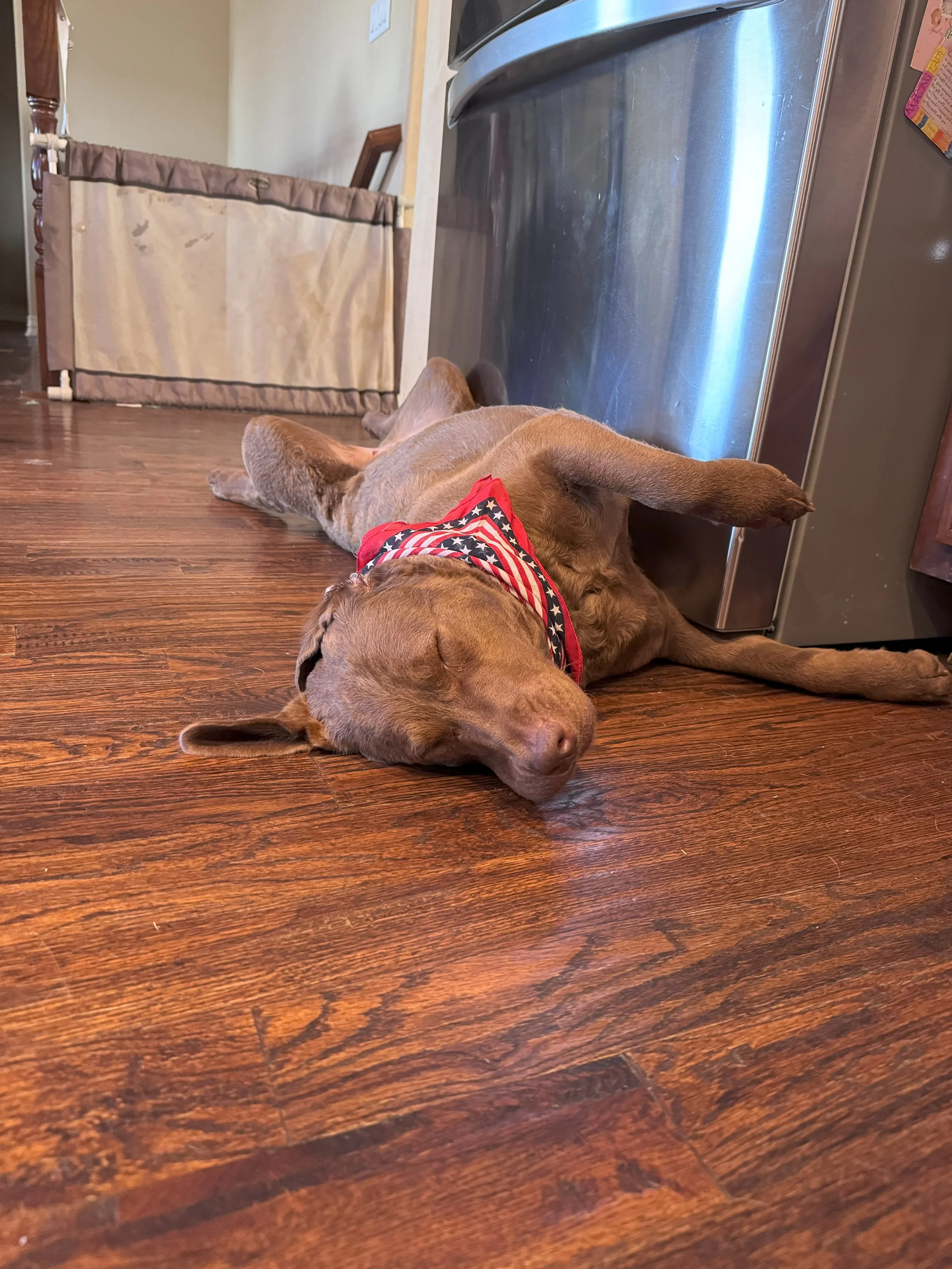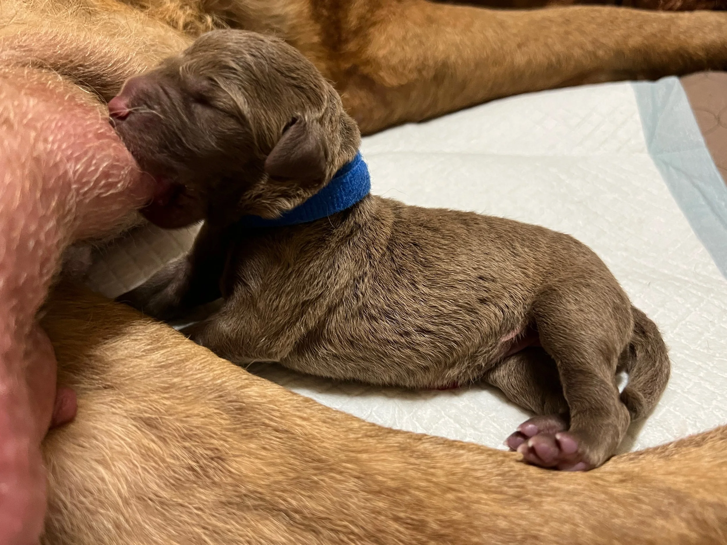 In January 2025, we bred Aspen (the "bride") to her "husband," Hagen, from Marks-a-Lot Kennels in Caddo Mills, TX. He is a show champion and master hunter.