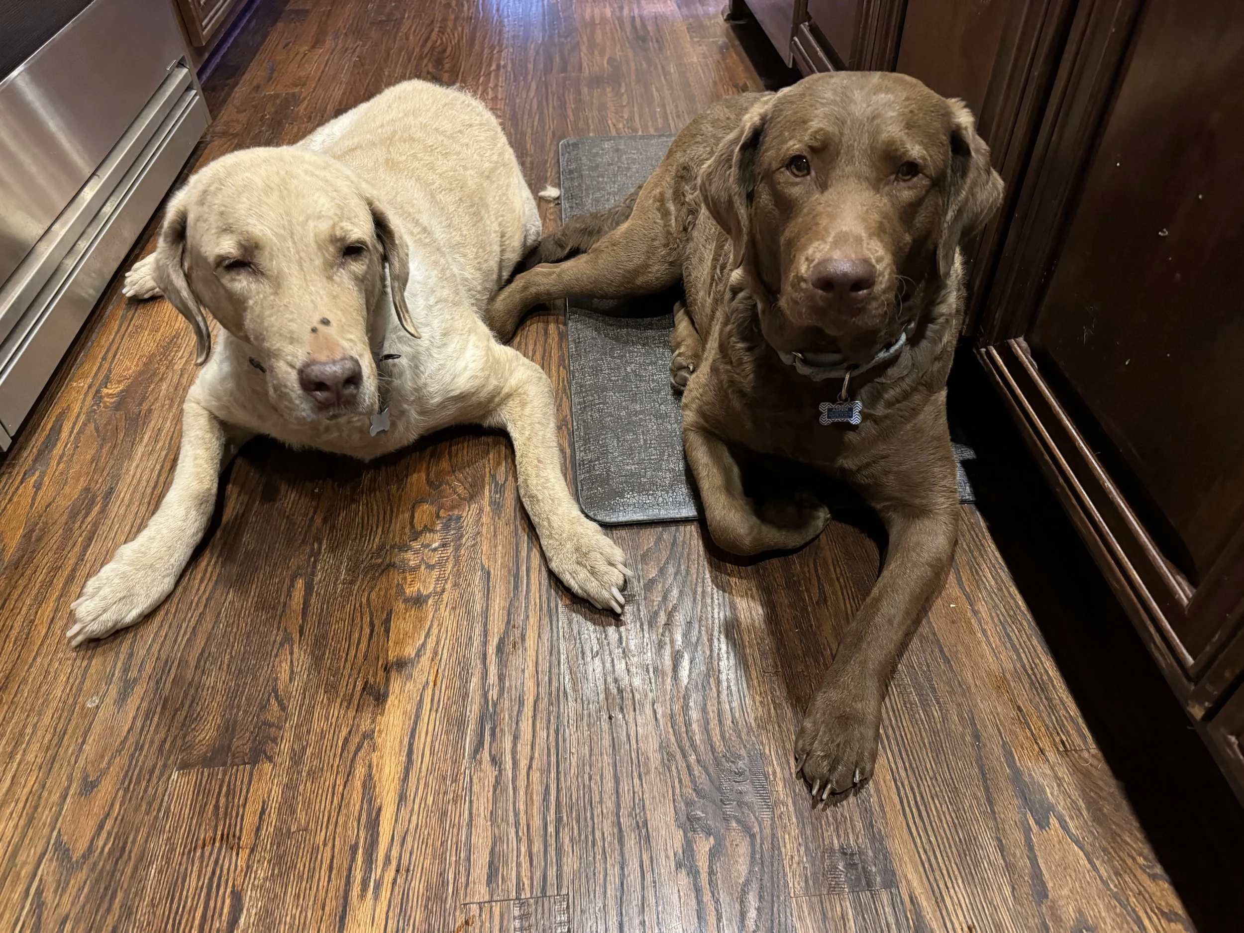 She was a Grandma’s girl before Cheyenne passed away on December 27, 2024, just two days after Christmas. They shared almost three years together, often lying side by side in the kitchen, eagerly awaiting “munchies” (trimmed edges of carrots, celery, kale, and cabbage) while I prepared a lunch smoothie for my husband and me. When Aspen was a puppy, Cheyenne helped Sierra by giving “diaper changes” and cleaning up an occasional accident. In Cheyenne’s last days, Aspen returned the love, gently licking her paw. Aspen learned many things from Grandma Cheyenne—how to eat plants through the fence, bark at delivery trucks, and swim in the lake or creek.